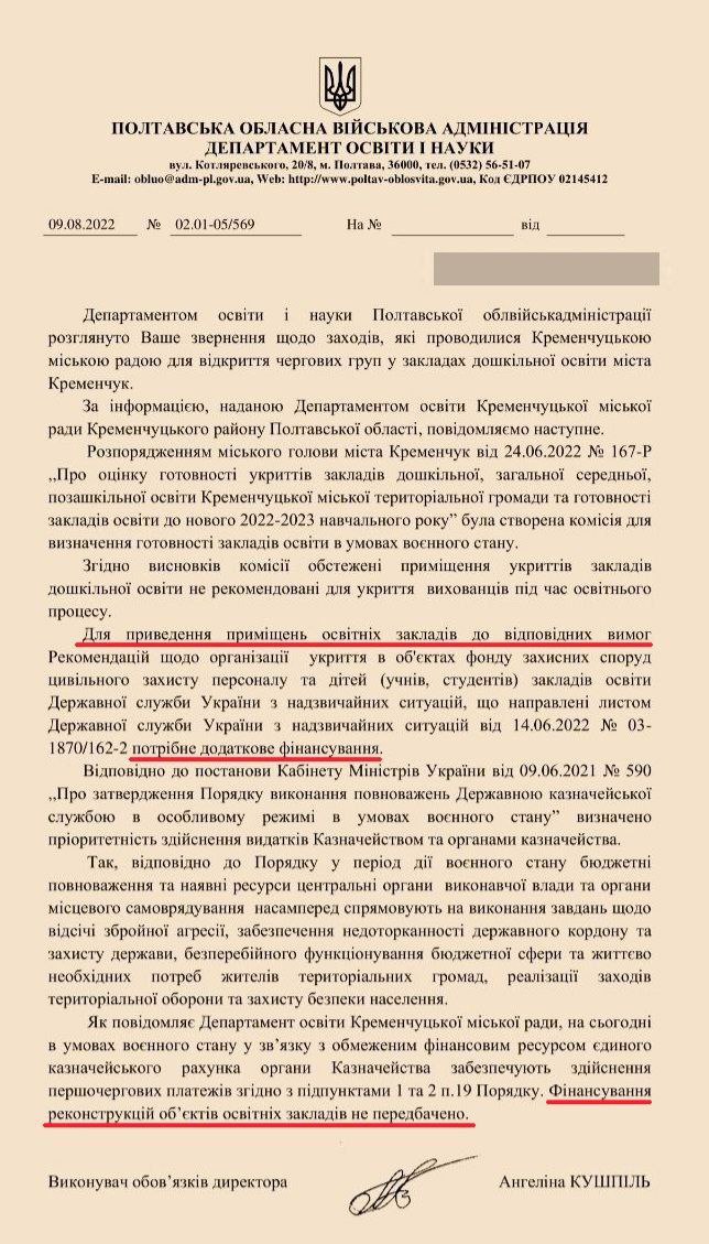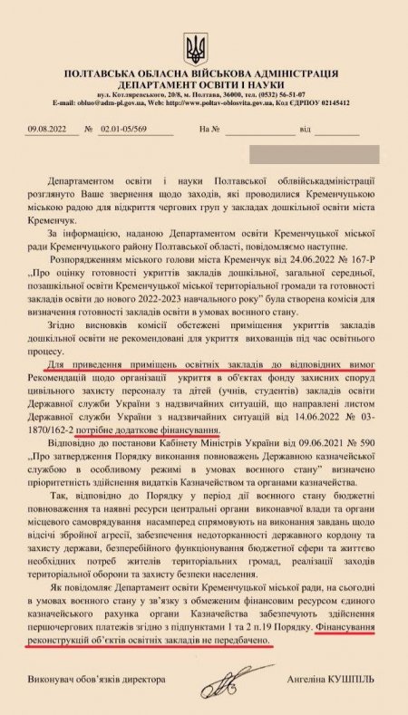 А ось і відповідь, яку вона отримала від департаменту освіти і науки Полтавської ОВА: