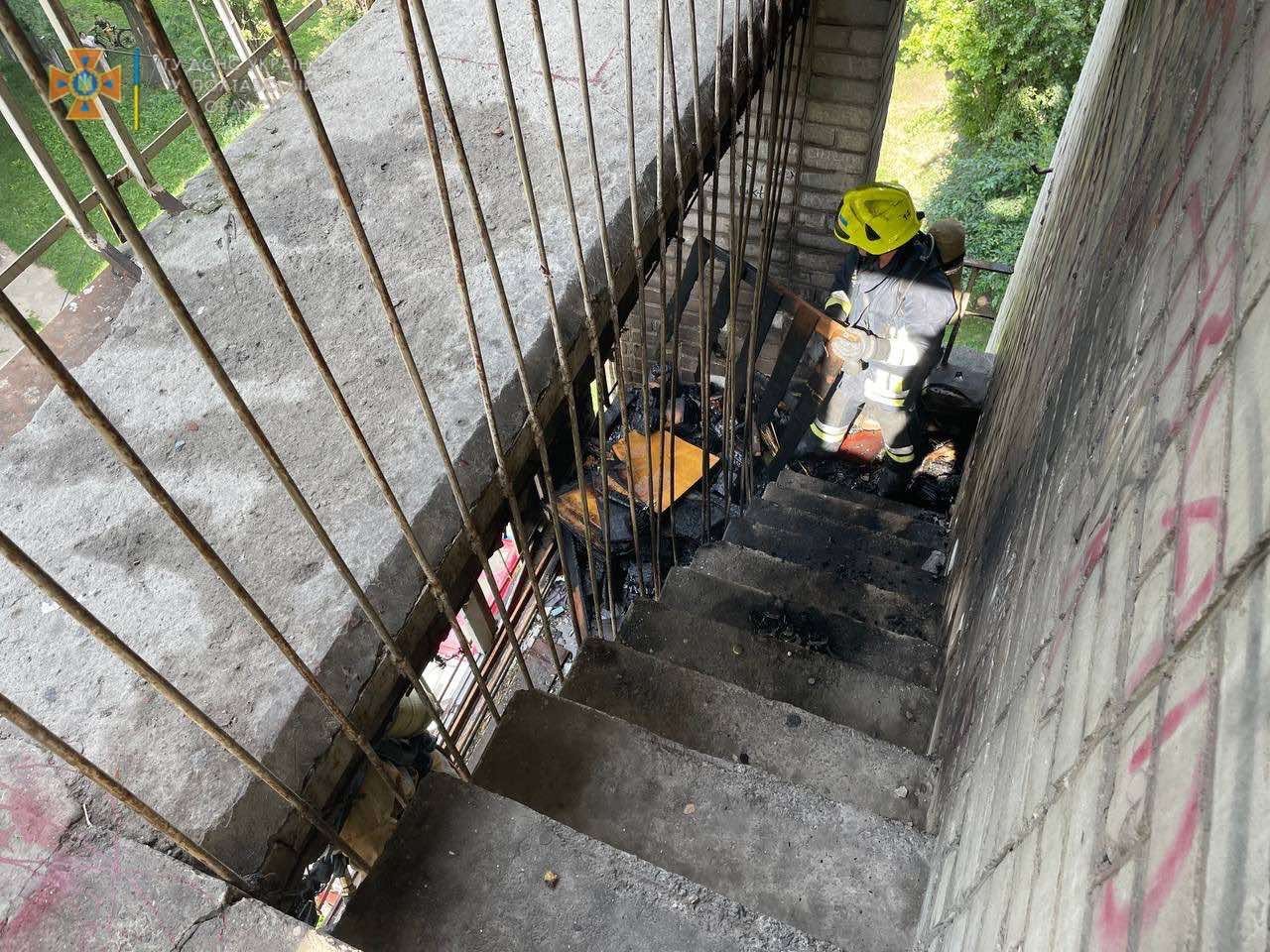 Ймовірно, причиною виникнення пожежі став необережно кинутий недопалок на речі, які були на сходовій клітини.