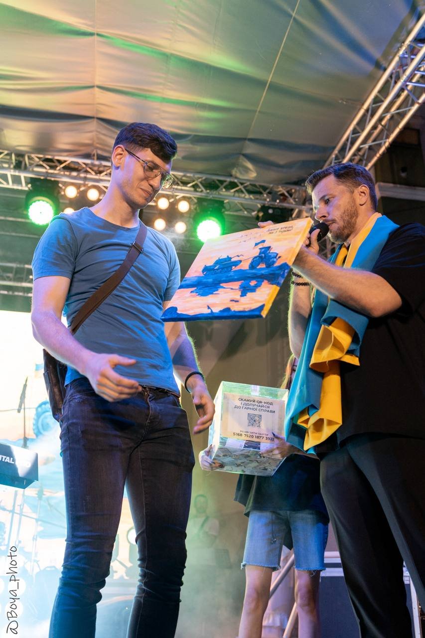 Усі охочі могли долучитися до збору коштів - перерахувати на картку або покласти до скриньки, які знаходилися біля сцени. Кожен, хто пожертвував на підтримку армії - отримав листівку з трактором, який везе ворожий підбитий танк.