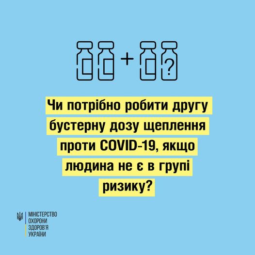 Якщо людина не належить до групи ризику та не має 60 років – наразі робити другу бустерну (ревакцинальну) дозу щеплення проти COVID-19 не рекомендовано. Про це повідомляють у Міністерстві охорони здоров’я України.