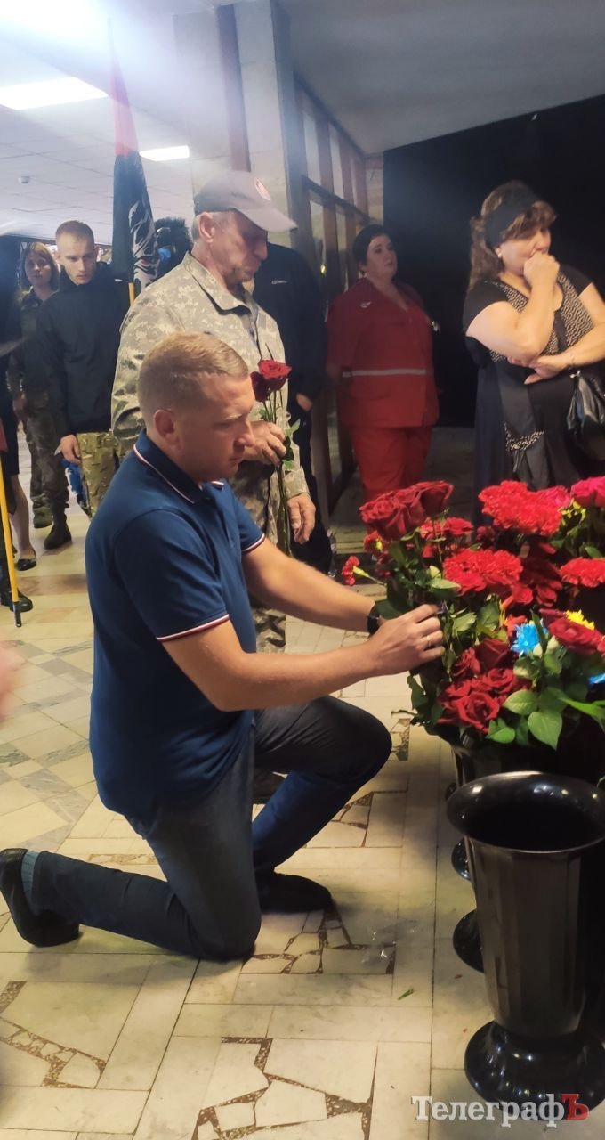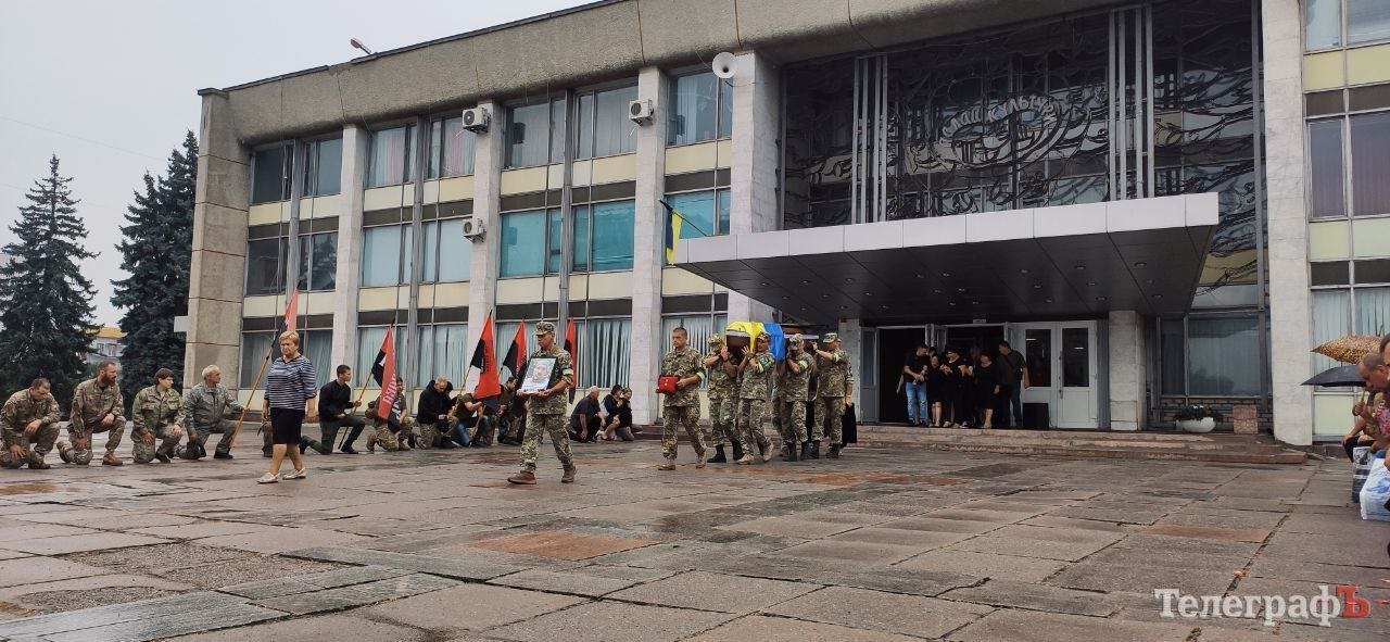 Під проливним дощем домовину винесли з Міського палацу культури. Побратими приспустили червоно-чорні стяги «Правого сектору» й разом із кременчужани схилившись на одне коліно віддали шану захиснику.