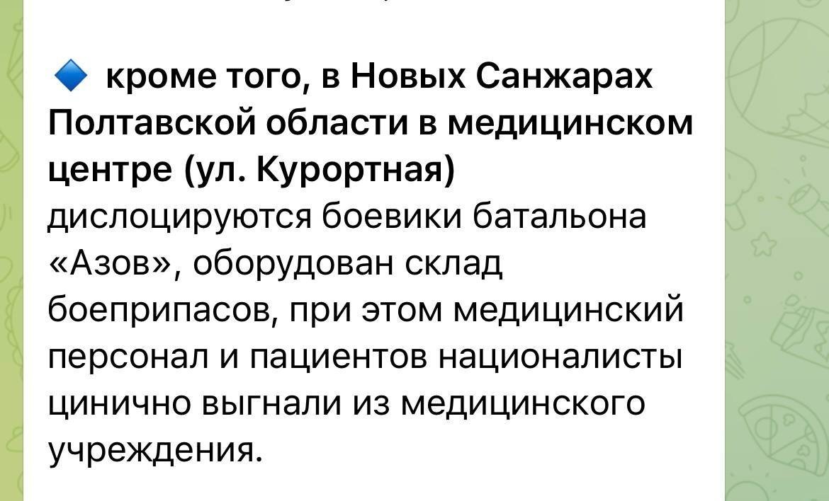 Російський військовий чиновник мізінцев повідомив, що у Нових Санжарах на Полтавщині нібито базується опорний пункт наших військових. Там є склад боєприпасів, а військові «Азову» захопили санаторій та вигнали звідти медперсонал.