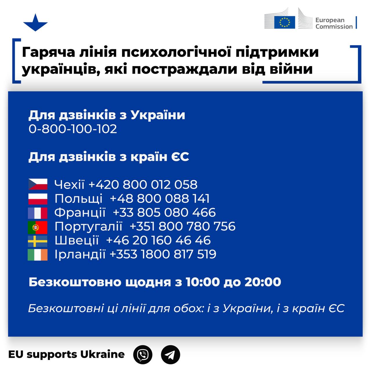 Для дзвінків з України гаряча лінія працює безкоштовно щодня з 10.00 до 20.00 за номером: 0 800 100 102.
