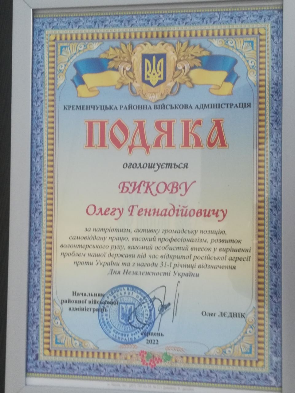 Кременчуцький активіст та волонтер Олег Биков сьогодні отримав подяку від начальника Кременчуцької районної військової адміністрації Олега Лєдніка.