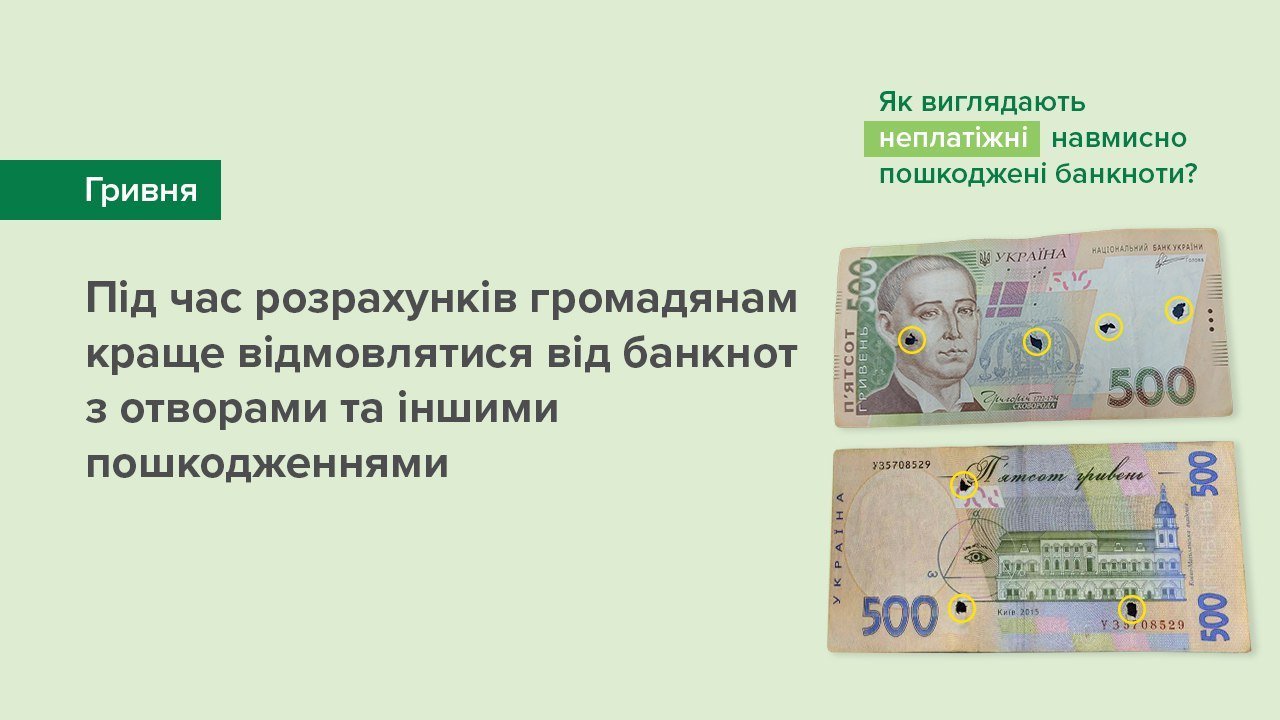 Адже ці банкноти – перестали бути платіжним засобом. Банки не мають права здійснювати обмін фізичним та юридичним особам пошкоджених вищезазначеними способами банкнот, а повинні вилучати їх, надсилати НБУ для дослідження та інформувати про подібні випадки правоохоронні органи.
