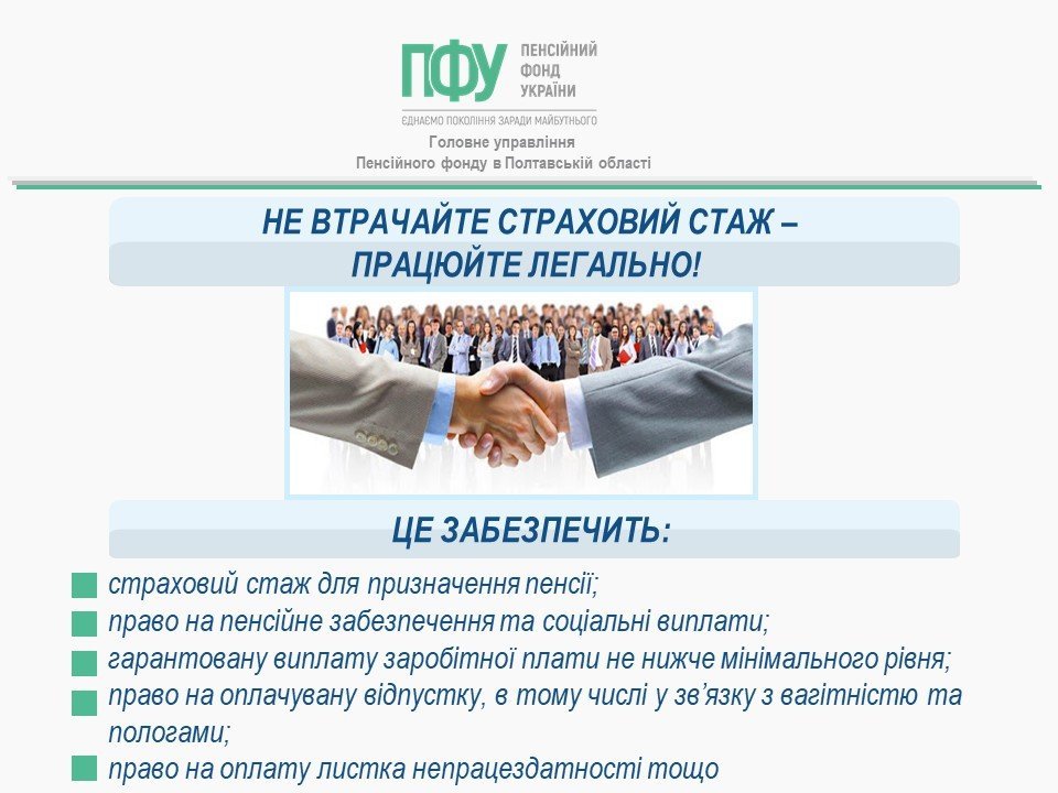 Перевіряйте чи оформлено ваші трудові відносини, чи своєчасно і повно сплачено страхові внески та тривалість набутого страхового стажу на вебпорталі електронних послуг Пенсійного фонду України (http://portal.pfu.gov.ua).