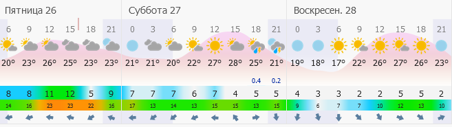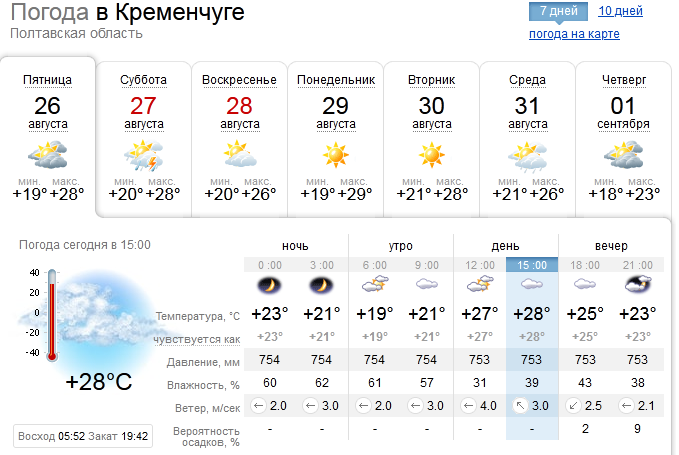 У вихідні, 27-28 серпня, у Кременчуці прогнозують теплу погоду. Температура вдень сягатиме +26+28 градусів, вночі прохолодніше +17+19 вище нуля. Мінлива хмарність, вітер змінних напрямків, 2-7 метрів за секунду.