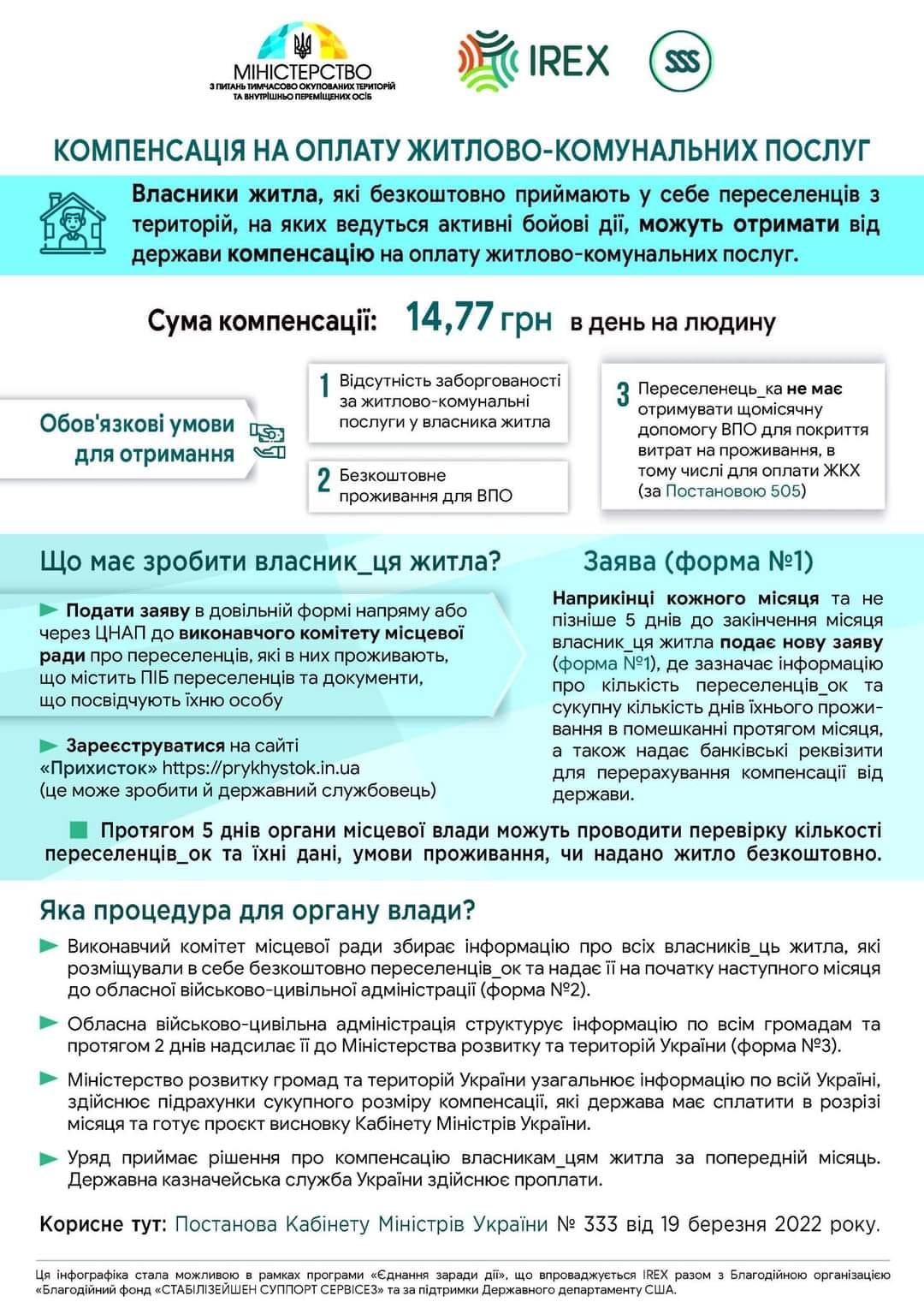 Українці, які безкоштовно прихистили внутрішньо переміщених осіб, можуть отримати компенсацію на оплату житлово-комунальних послуг. Як повідомили в Міністерстві юстиції, її розмір становить 14,77 грн за день на людину. Щоб отримати кошти від держави, необхідно дотримуватися кількох умов: у власника житла не має бути боргу за комуналку; житло переселенцям має бути надано безоплатно; переселенці, які у вас мешкають, не отримують щомісячної допомоги на проживання.