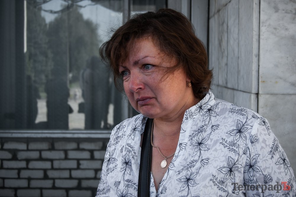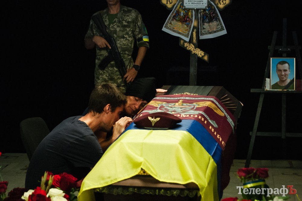 Мама, схилившись над домовиною, огорнутою у синьо-жовтий стяг та прапор десантників, востаннє пригортає до серця свого синочка