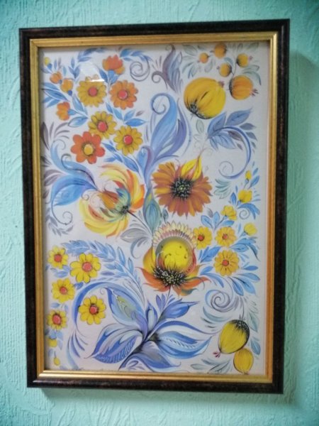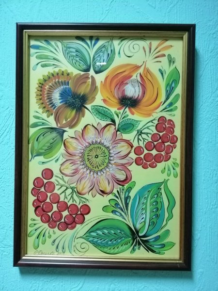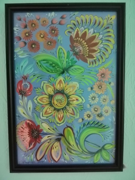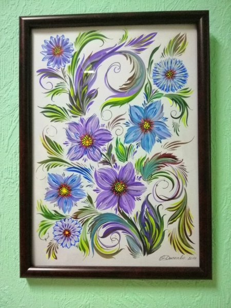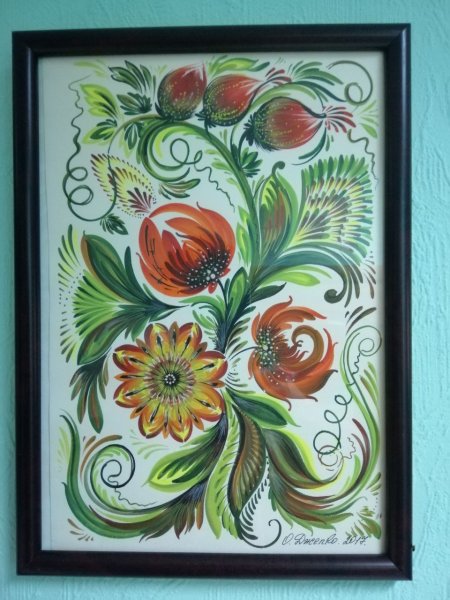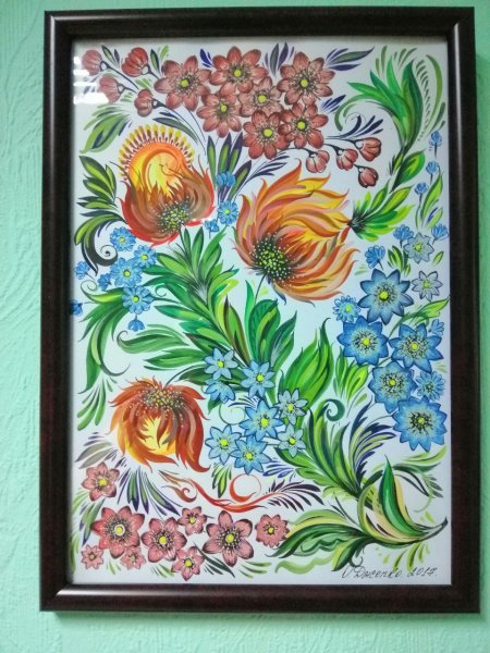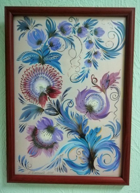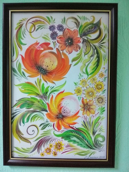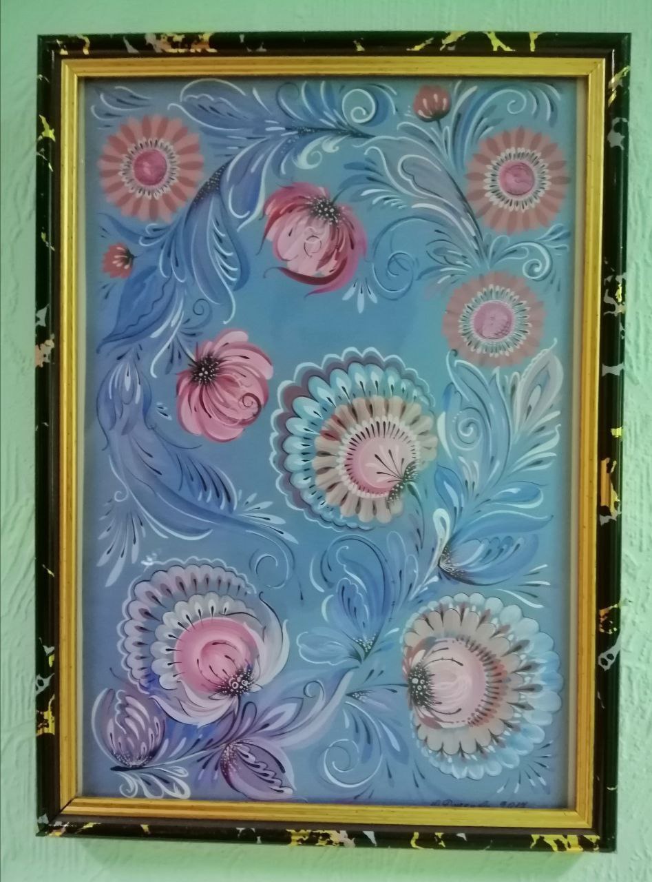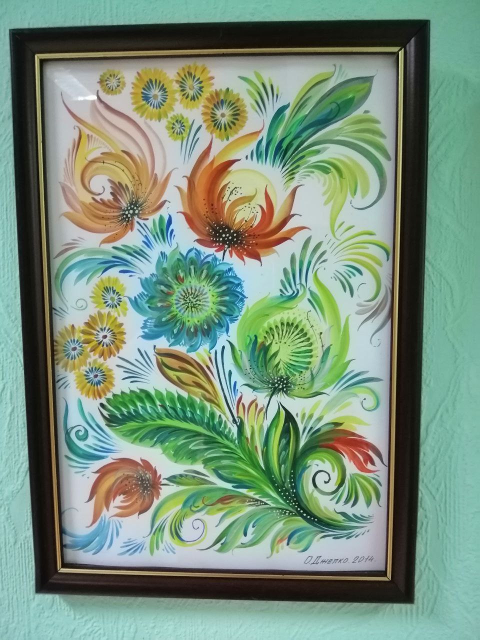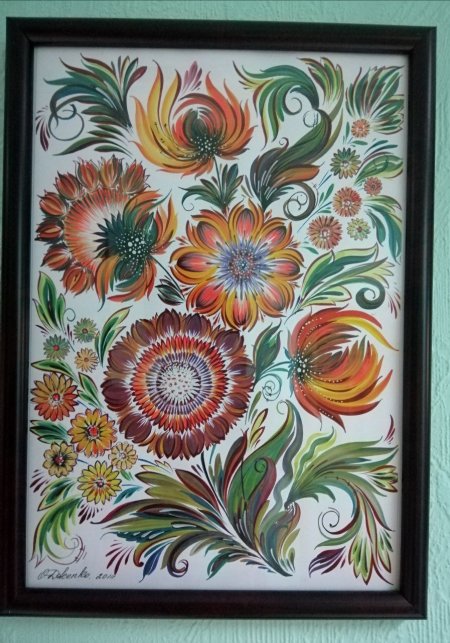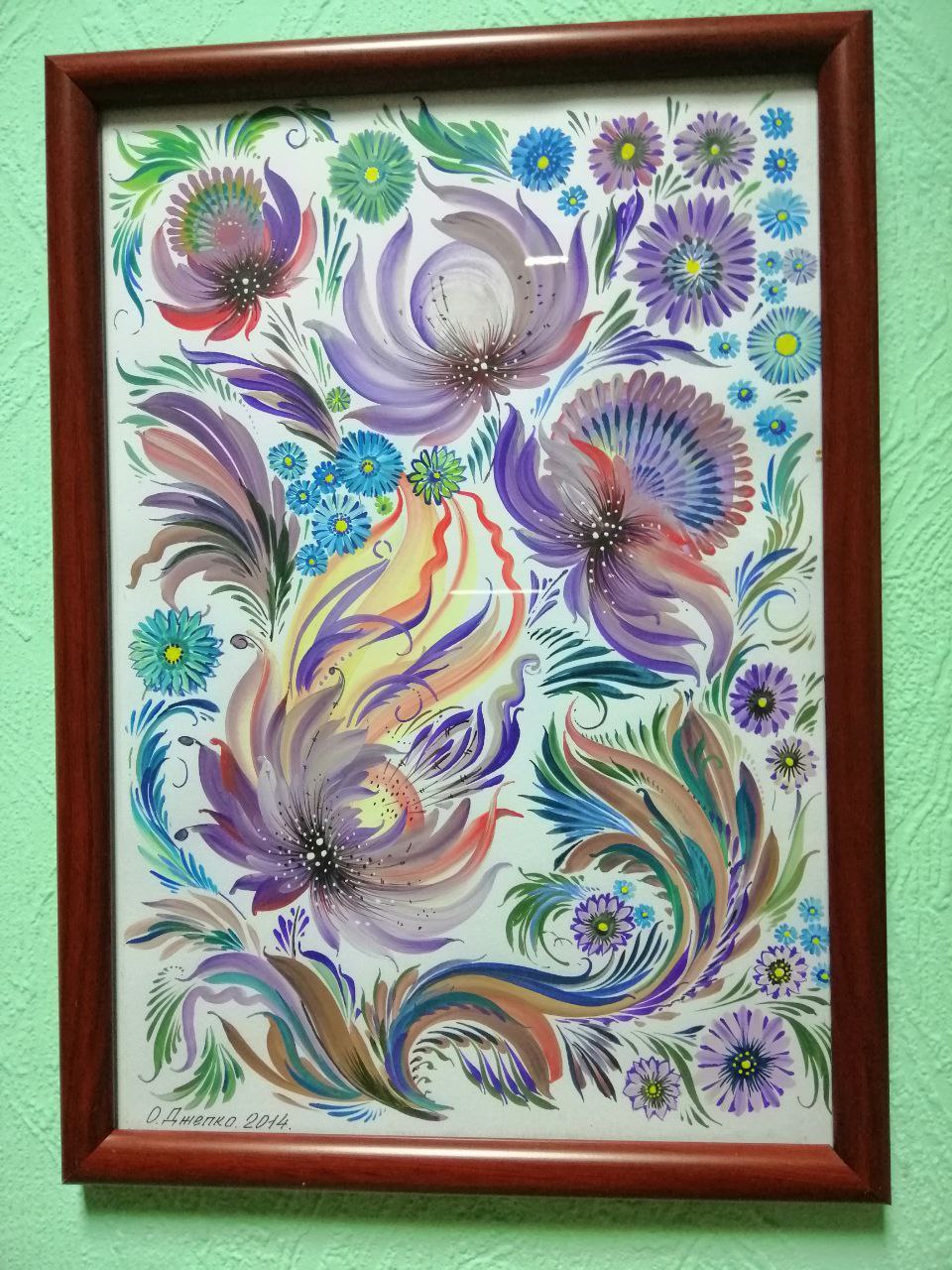 Експозиція складається з 13 робіт, написаних аквареллю та гуашшю кілька років тому. В них дмитрівчанка наслідує петриківський розпис – один із видів українського декоративно-орнаментального народного малярства. Переважання рослинних візерунків, здебільшого квіткових, є характерною особливістю цього розпису.