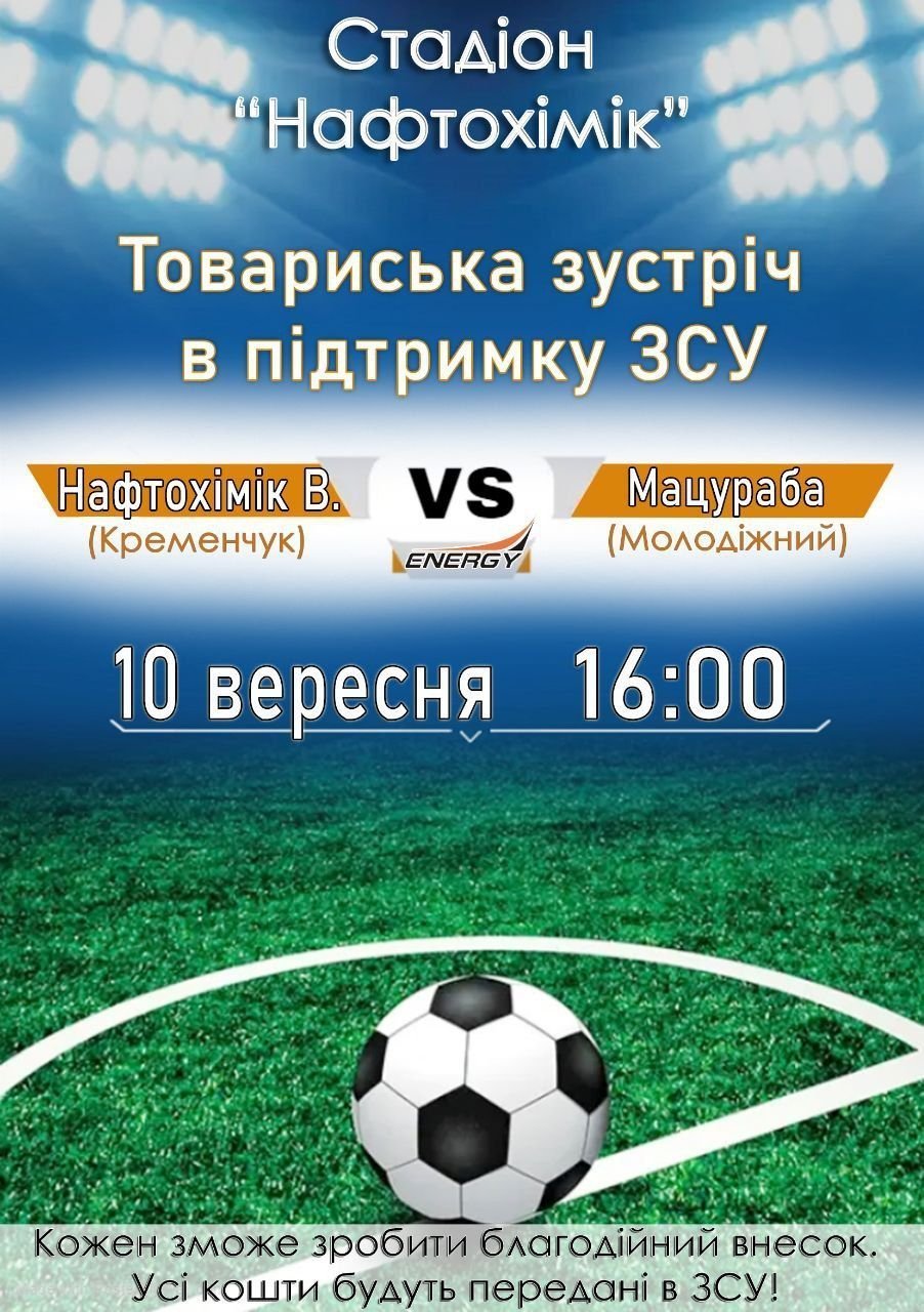 У Кременчуці 10 вересня відбудеться товариська зустріч у підтримку Збройних Сил України. На полі зустрінуться команди «Нафтохімік В» та «Мацураба». Гра розпочнеться о 16.00 на стадіоні «Нафтохімік».