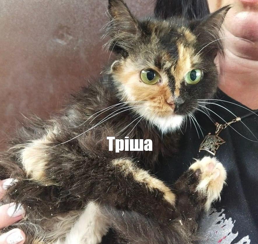 Тріша – кішка із непростою долею. Очевидці бачили, як її викинули з вікна. Киця пухнаста, має яскраве і рідкісне забарвлення, у неї великі зелені очі. Їй приблизно 2 роки, вже стерилізована та повністю здорова.