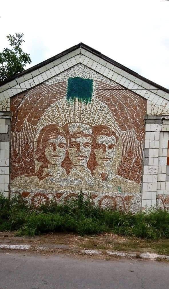 На будівлі була мозаїка радянських часів, на якому зображені робітники та серп і молот. Зараз символи замалювали зеленою фарбою.