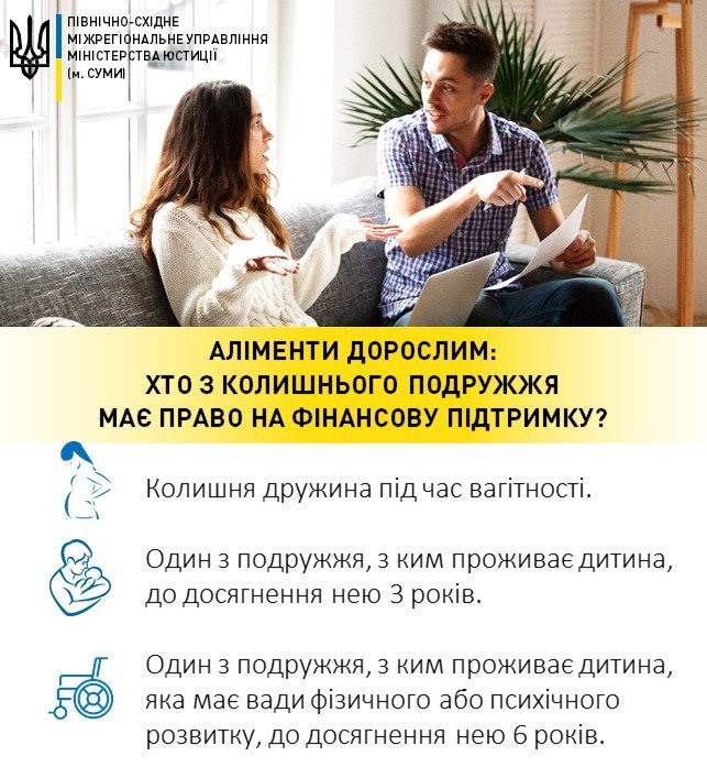 За словами очільниці Північно-Східного міжрегіонального управління Міністерства юстиції (м. Суми) Ірини Свистун, претендувати на аліменти може кожен з колишнього подружжя, якщо: