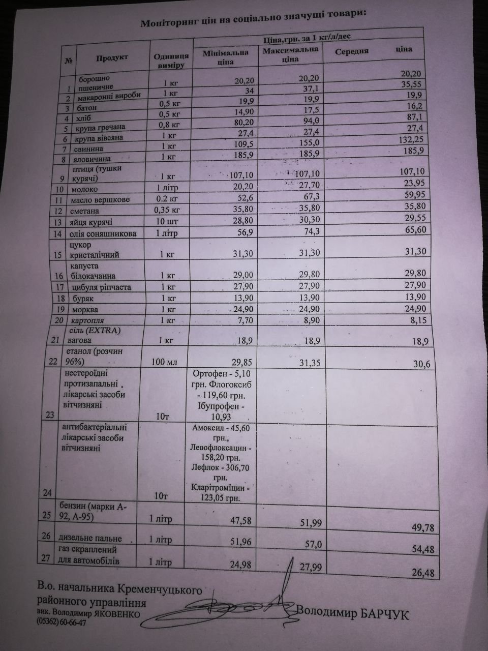 Керівник району надав інформацію Кременчуцького районного управління Держпродспоживслужби щодо моніторингу цін на соціально значущі продукти за минулий тиждень.