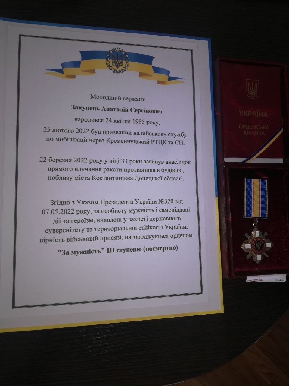 Сьогодні, 9 вересня, начальник Кременчуцької районної військової адміністрації Олег Лєднік, голова районної ради Дмитро Колотієвський та представник Кременчуцького районного територіального центру комплектування та соціальної підтримки (колишній військкомат) вручили орден «За мужність» 3-го ступеня дружині загиблого Героя Ірині Закупець.