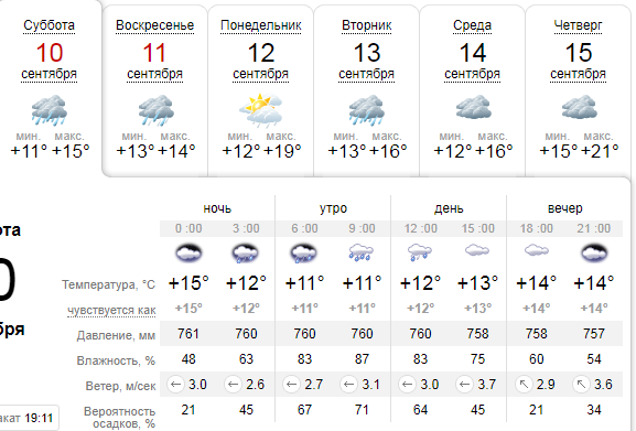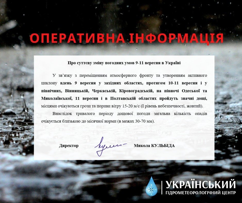 У зв’язку з переміщенням атмосферного фронту та утворенням активного циклону протягом 10-11 вересня і у північних, Вінницькій, Черкаській, Кіровоградській, на півночі Одеської та Миколаївської, 11 вересня і в Полтавській областях пройдуть значні дощі, місцями очікуються грози та пориви вітру 15-20 м/с, – йдеться в повідомленні.