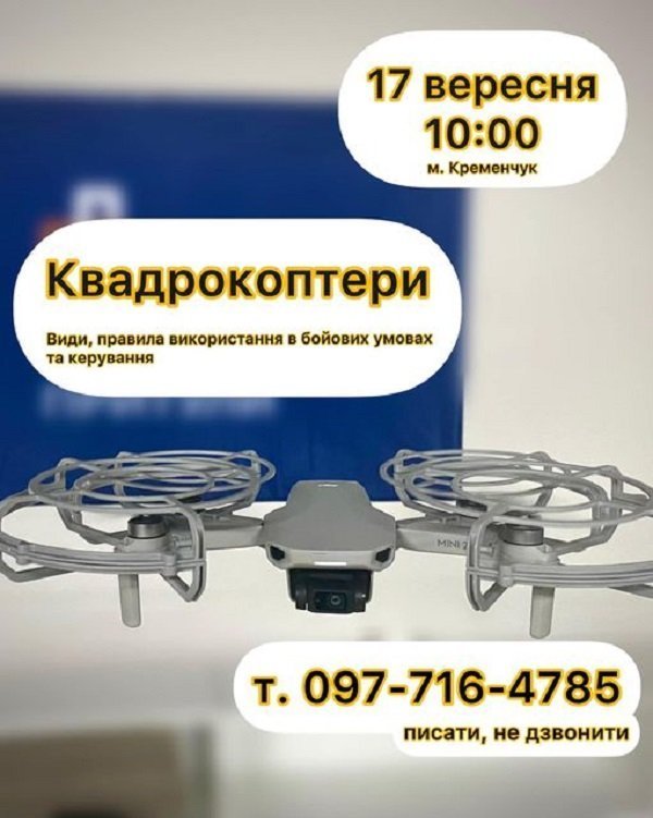 У суботу, 17 вересня, кременчужанам розкажуть як користуватися квадрокоптерами. Волонтер Роман Бутрімов розкаже про види, правила використання в бойових умовах та керування.