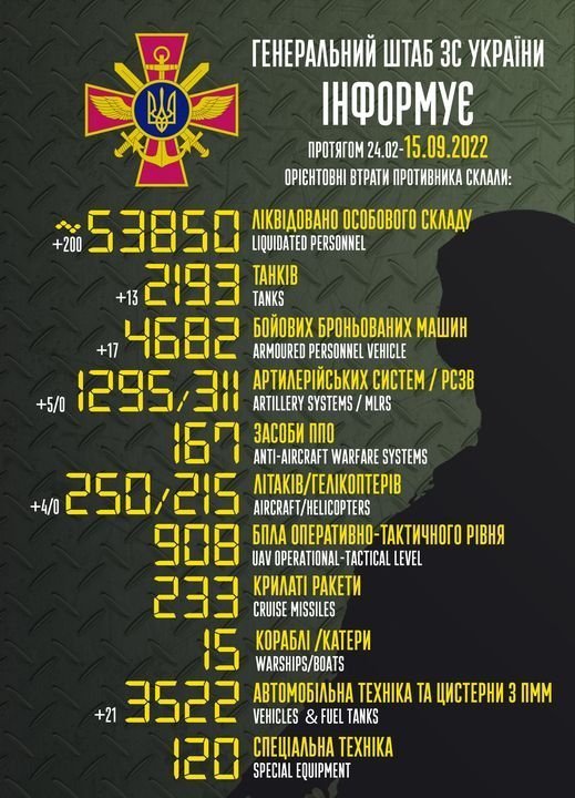А за даними Генштабу ЗСУ загальні бойові втрати противника з 24.02 по 15.09 орієнтовно склали: