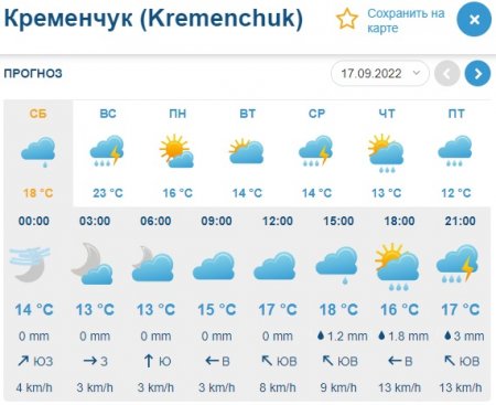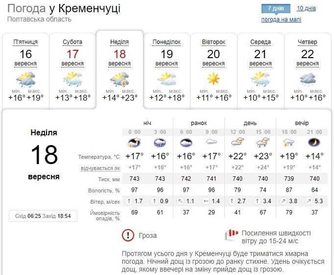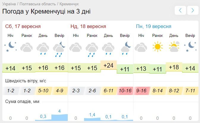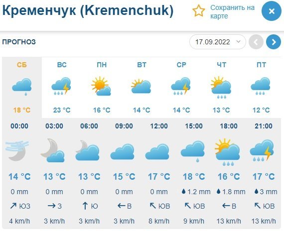 Sinoptik обіцяє, що усю суботу, 17 вересня, кременчуцьке небо буде затягнуте хмарами, які після 18.00 принесуть зливу. Опади «візьмуть перерву» лише у першій половині дня у неділю, 18 вересня, але ввечері місто знову накриє дощ з грозою і сильним вітром. Зате буде досить тепло – у неділю повітря прогріється до +23°С.