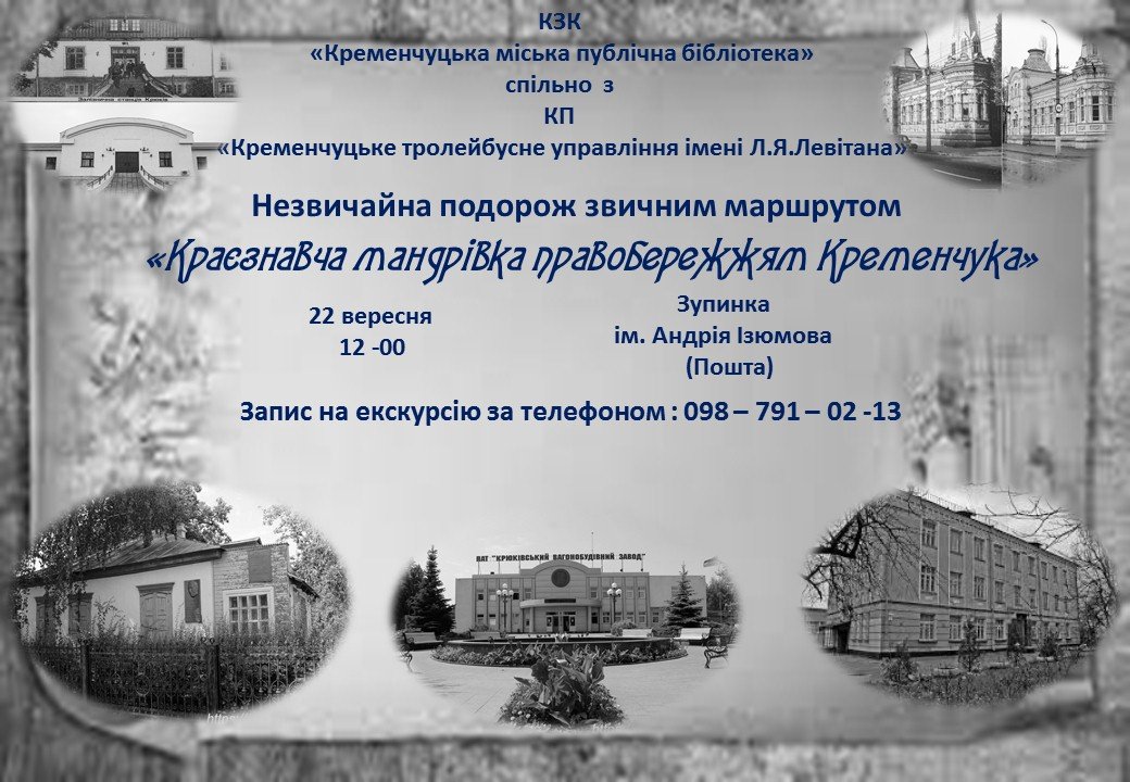 22 вересня за ініціативи бібліотеки та тролейбусного управління відбудеться екскурсія «Краєзнавча мандрівка правобережжям Кременчука». Місце збору о 12.00 на зупинці ім.Андрія Ізюмова.
