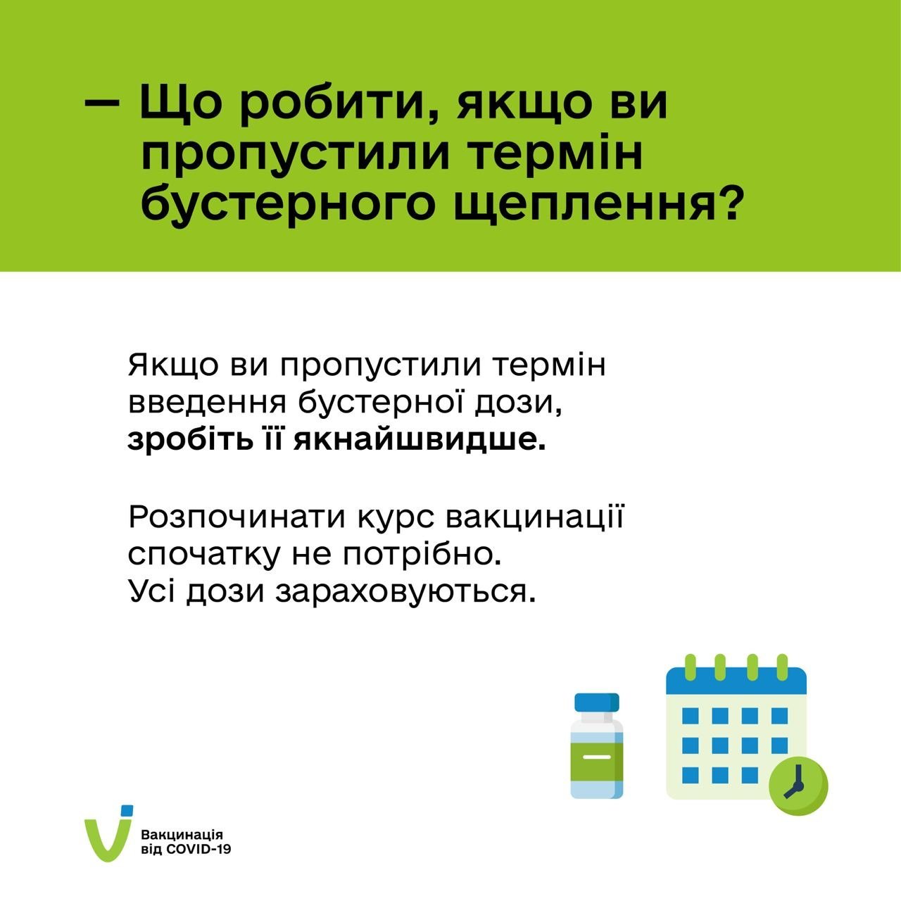 Також наказом зменшено мінімальні терміни між базовим (первинним) курсом вакцинації та бустерною дозою. Тепер бустер можна зробити через 5 місяців після завершення базового курсу. Раніше цей термін складав щонайменше 6 місяців.