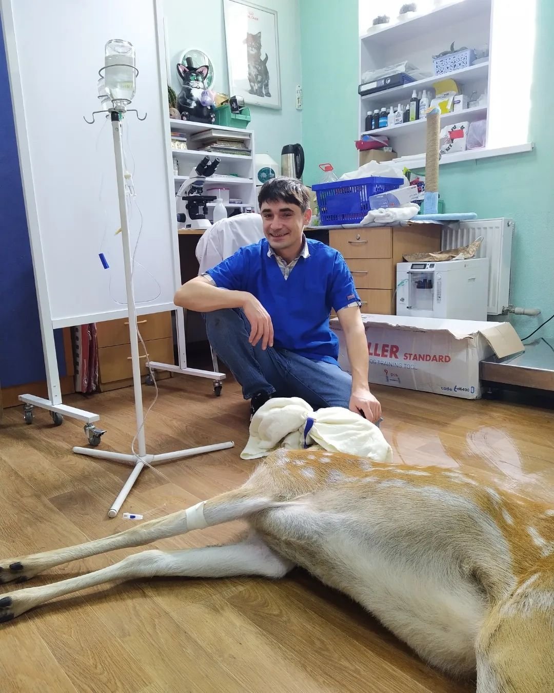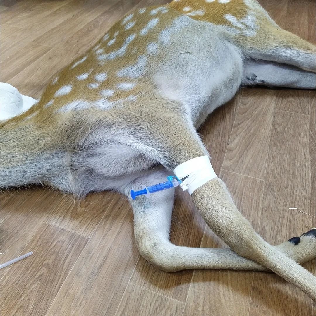 Самка оленя мала народити ще два-три дні тому. Проте не змогла, адже плід застряг. Небайдужі громадянам вдалося спіймати її, коли олениця вже втрачала сили. Добрі люди привезли її до ветеринарної клініки, де тварині надали необхідну допомогу. На жаль, вберегти мале оленятко не вдалося.