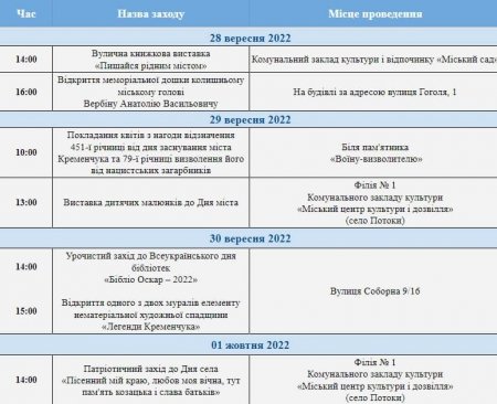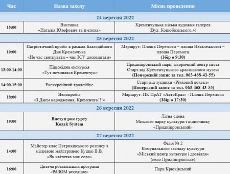 Наводимо актуальну програму заходів, що проходитимуть у Кременчуці, Придніпрянському та Потоках з 24 вересня до 1 жовтня.