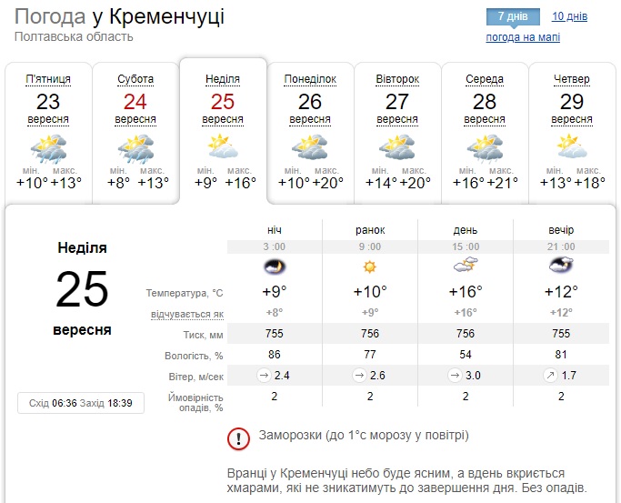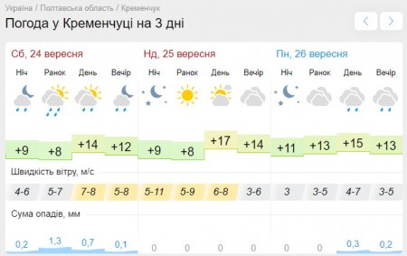Sinoptik прогнозує дощі у суботу, 24 вересня, у період з 12.00 до 15.00, а у неділю, 25 вересня, зранку заморозки до -1°С у повітрі. Здебільшого кременчуцьке небо під час вікенду буде затягнуте хмарами, лише зрідка показуватиметься сонечко. Температура повітря коливатиметься у межах +8...+16°С.