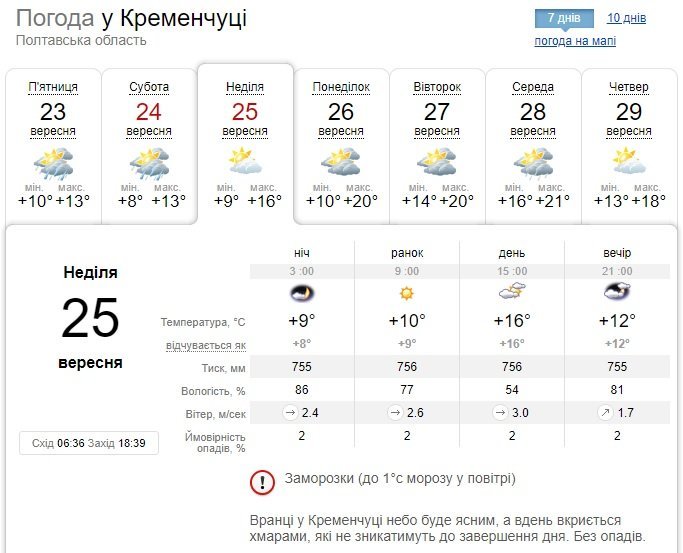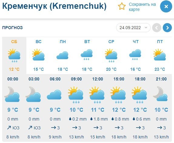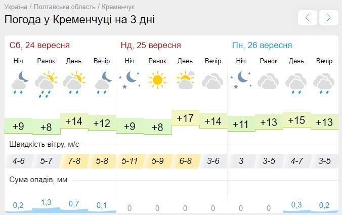 Sinoptik прогнозує дощі у суботу, 24 вересня, у період з 12.00 до 15.00, а у неділю, 25 вересня, зранку заморозки до -1°С у повітрі. Здебільшого кременчуцьке небо під час вікенду буде затягнуте хмарами, лише зрідка показуватиметься сонечко. Температура повітря коливатиметься у межах +8…+16°С.
