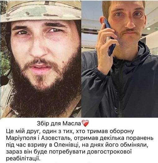 Головний сержант 1 батальйону полку Азов Кирило Геннадійович Масалітін (21.06.94) наразі проходить реабілітацію. Друзі у соцмережах повідомляють, що військовий з позивним Масло отримав поранення під час вибуху в Оленівці.