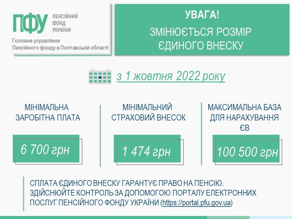 З 1 жовтня в Україні збільшується розмір єдиного соціального внеску (ЄСВ). У Пенсійному фонді нагадують, що збільшення пов’язане зі збільшенням розміру мінімальної зарплати, яка становитиме 6700 гривень. Єдиний внесок, що сплачують підприємці, нараховується щомісячно за ставкою 22% від «мінімалки». Таким чином з 1 жовтня мінімальний страховий внесок становитиме 1 474 грн (6700 х 22%), а максимальна база для нарахування ЄСВ досягне 100 500 грн.