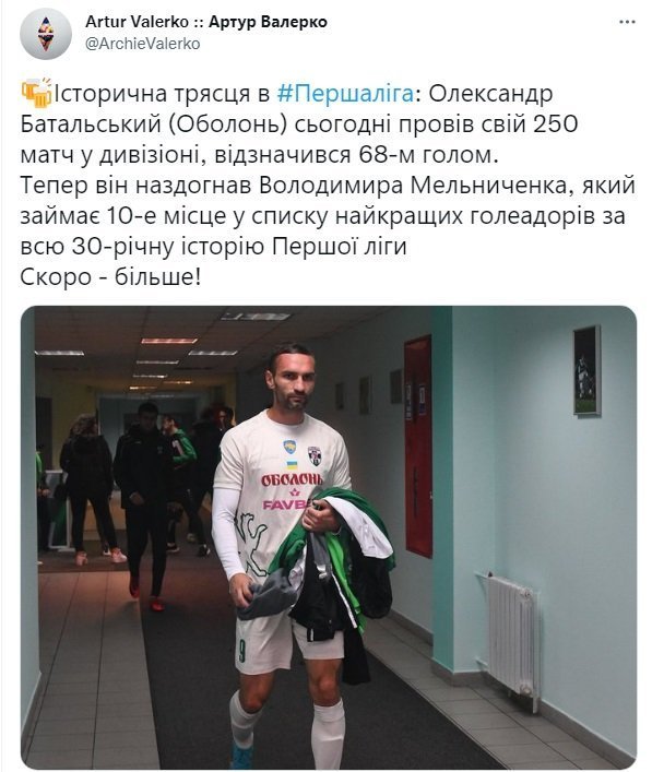 До перерви Оболонь забила ще й утретє – тепер Краснопір пасом із глибини поля запустив через правий фланг Мороза, його м’яку подачу невдало перервав захисник, так що Олександр Батальський міг спокійно розстрілювати ворота з лінії воротарського майданчика, прийняв м’яч на груди й пробив з розвороту правою ногою – 0:3. Голеадор киян ввійшов у десятку найкращих бомбардирів Першої ліги за всю історію: