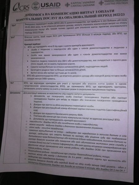 Внутрішньо переміщені особи (ВПО), які зареєстровані в Кременчуці чи інших громадах Кременчуцького району наступного тижня можуть отримати компенсацію витрат з оплати комунальних послуг або тверде паливо для опалення житла протягом опалювального періоду 2022-2023 років у розмірі 16200 грн на одне домогосподарство.