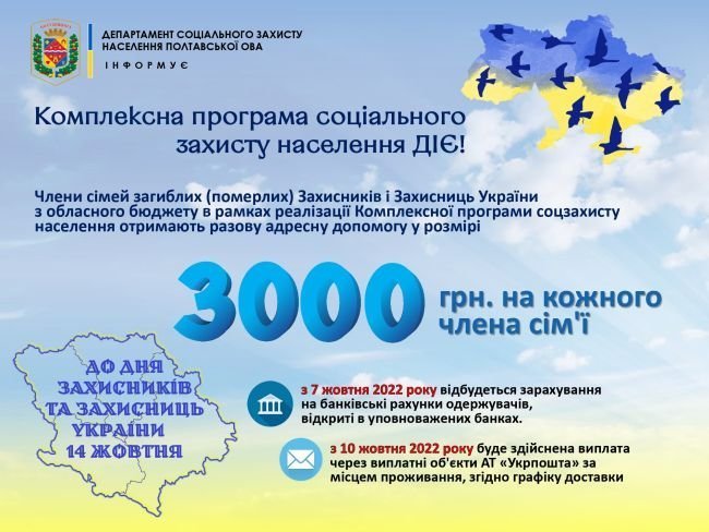 Члени сімей загиблих (померлих) Захисників і Захисниць України з обласного бюджету в рамках реалізації Комплексної програми соціального захисту населення отримають 3 тис. грн в якості разової адресної допомоги до Дня захисників і захисниць України.