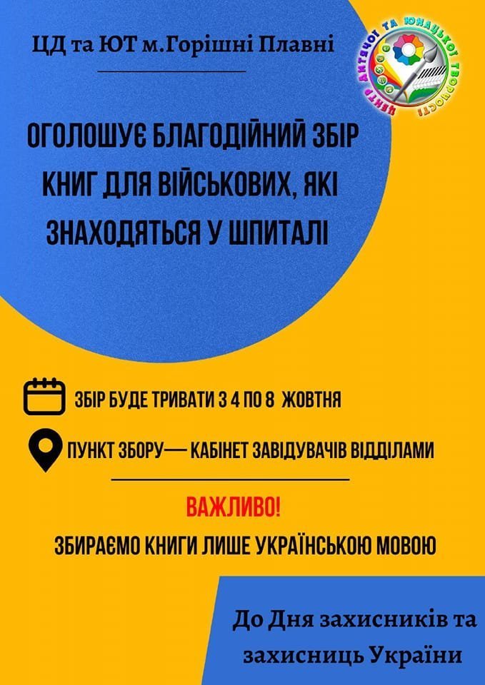 7-8 жовтня у кабінеті завідувачів відділів ЦДтаЮТ приймають книжки для військових, які знаходяться у шпиталях.