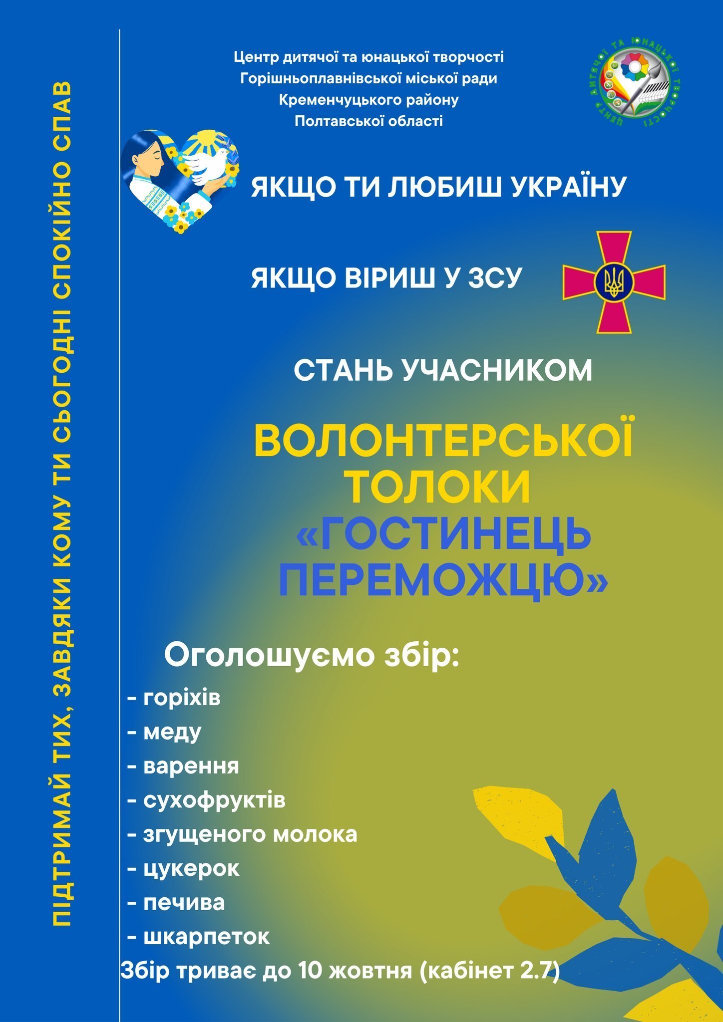 – Якщо ти віриш в Україну. Якщо ти віриш у ЗСУ. Стань учасником волонтерської толоки «Гостинець переможцю», – закликали у ЦДтаЮТ м. Горішні Плавні.