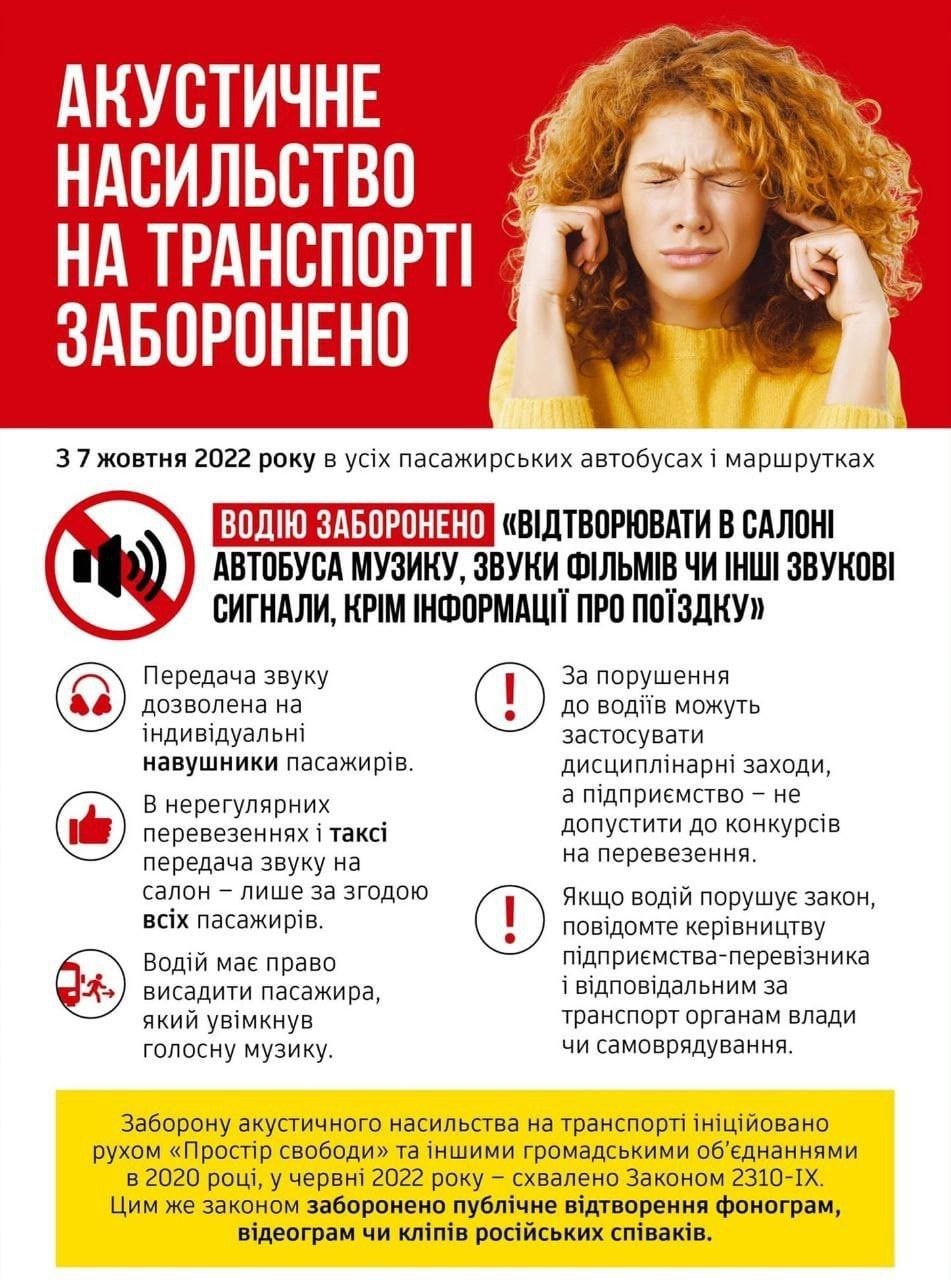 Тож відтепер водіям рейсових пасажирських автобусів та маршруток не можна «відтворювати в салоні автобуса музику, звуки фільмів чи інші звукові сигнали, крім інформації про поїздку». Заборона поширюється як на міський транспорт, так і на приміський, міжміський, міжнародні маршрути. Музику чи фільми можна транслювати на індивідуальні навушники пасажирів.