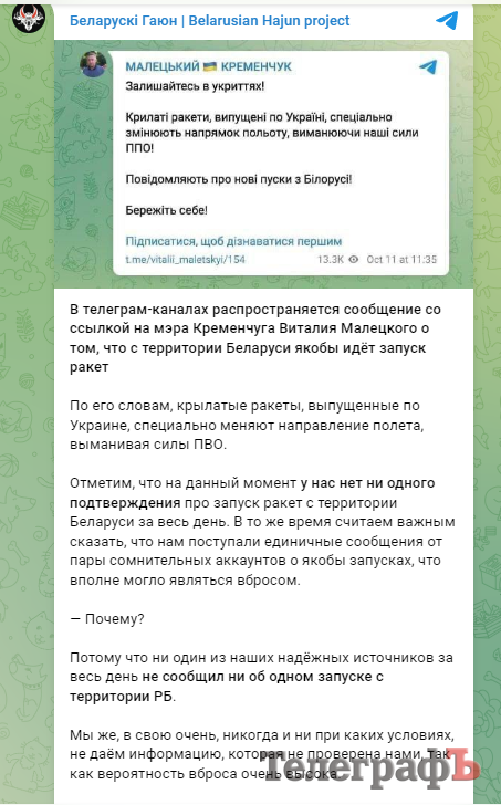 Телеграм-канал Беларускі Гаюн, що від початку повномасштабного вторгнення відстежує переміщення військової техніки ворога і повідомляє про злети винищувачів і ракет, спростував інформацію міського голови Кременчука Віталія Малецького щодо запуску ракет з території Білорусі у бік Кременчука. Які нібито «виманюють наші сили ППО».
