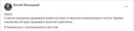 Нещодавно ми писали, що Кременчуцька РВА закликає керівників територіальних громад скоротити споживання електроенергії, а ввечері міський голова Віталій Малецький заявив, що освітлення на вулицях Кременчука поки що не буде.