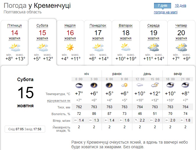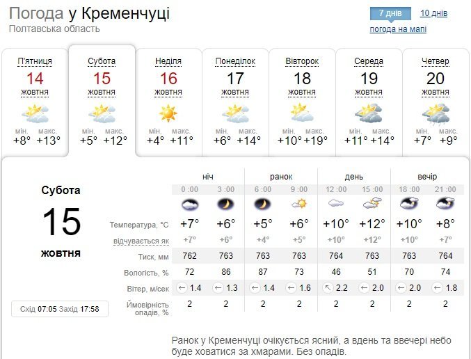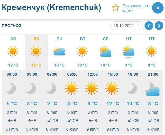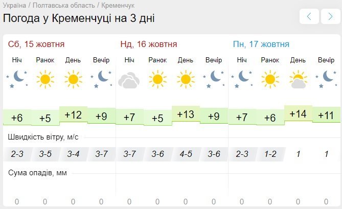 Sinoptik обіцяє мінливу хмарність вдень та ввечері у суботу, 15 жовтня, а у неділю, 16 жовтня, – виключно сонячну погоду. Стовпчики термометрів покажуть від +4°С до +12°С.