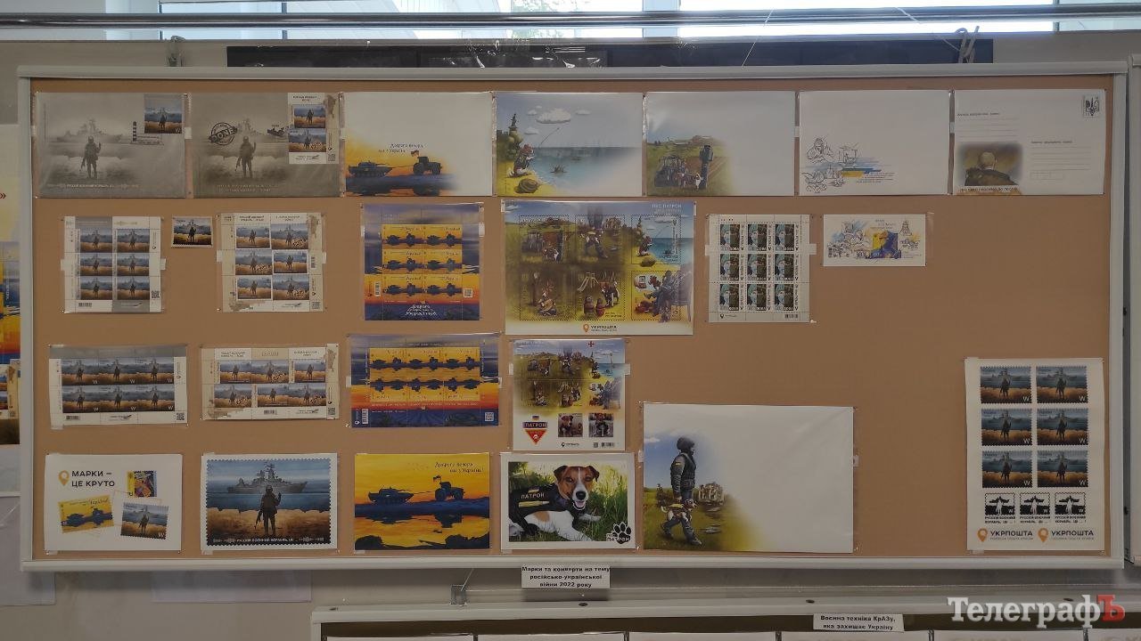 На одному зі стендів представлена поштова продукція від «Укрпошти» – марки, поштівки й конверти про руский воєнний корабль, гадяцьке сафарі, пса Патрона та інші сюжети з «нової» воєнної тематики повномасштабного вторгнення.