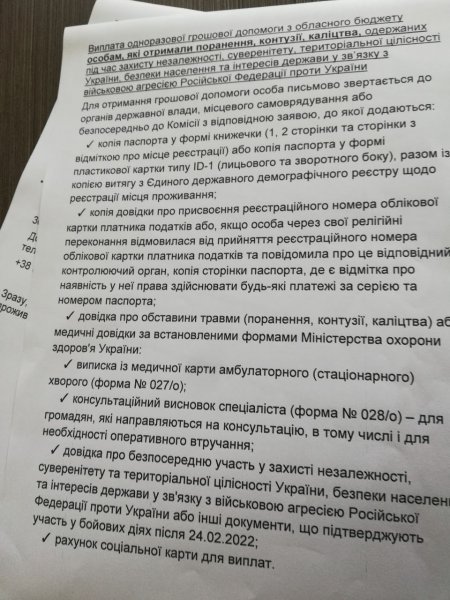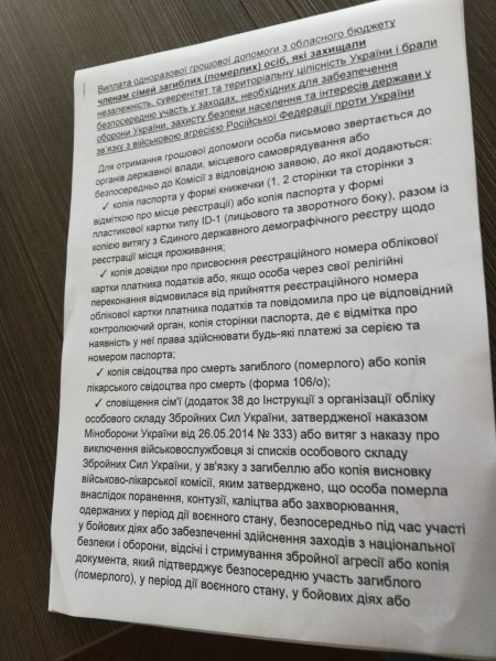 Він пояснив, що для отримання одноразової грошової допомоги особа має письмово звернутися до органів державної влади, органів місцевого самоврядування або безпосередньо до Комісії, яка займається цими питаннями, з відповідною заявою, до якої додати необхідні документи. Сума грошової допомоги залежить від важкості поранення, контузії чи каліцтва. Максимальна сума допомоги з обласного бюджету для родин загиблих - 50 тисяч грн.