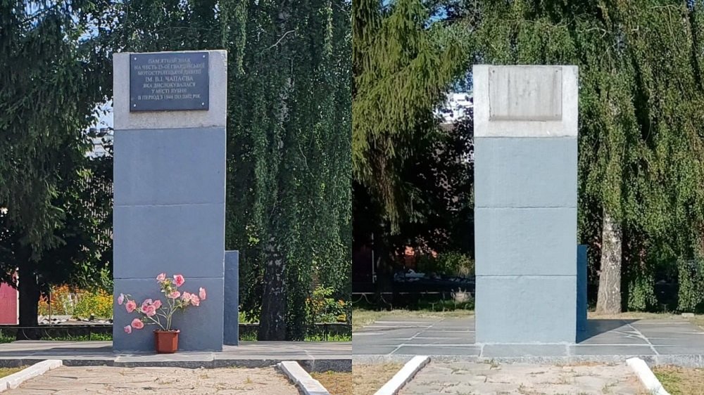 Рік тому у Лубнах активісти ГО «Гонор» та ветерани російсько-української війни демонтували пам’ятник російському більшовицькому комдиву Василю Чапаєву. Проте на постаменті лишилася дошка-напис, яка звеличувала радянську дивізію імені Чапаєва. Тож демонтували і цей знак.