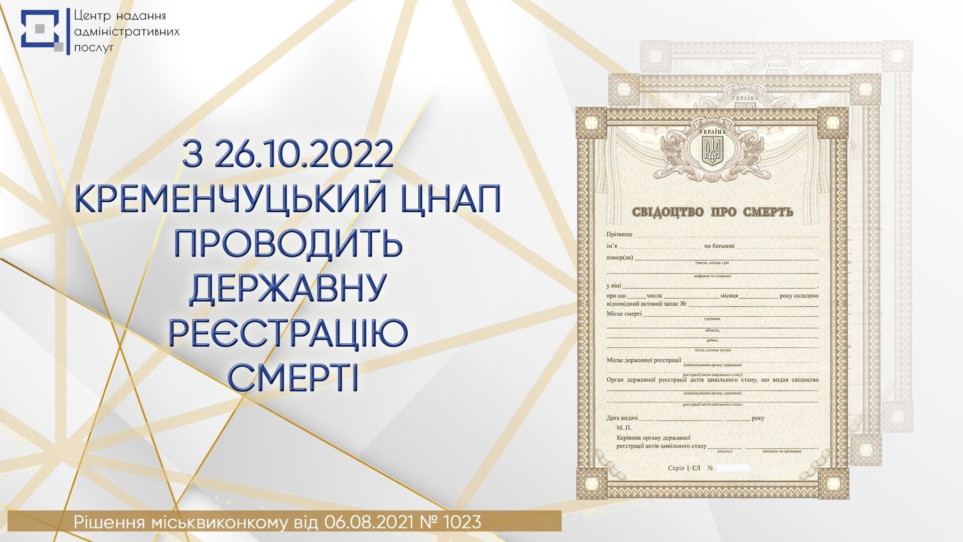 Кременчуцький ЦНАП починає реалізовувати повноваження у сфері реєстрації актів цивільного стану відповідно до рішення виконкому від 6 серпня 2021 р. № 1023. Про це повідомили у пресслужбі міського Центру надання адміністративних послуг.