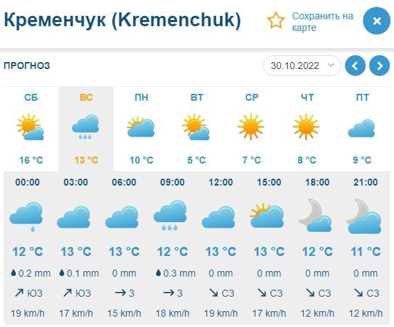 Ventusky обіцяє незначний короткочасний дощ вранці у неділю, 30 жовтня. Також у цей день може розгулятися вітер до 19 км/год. Загалом вихідні пройдуть без опадів. Сповпчики термометрів покажуть від +8°С до +16°С.