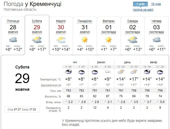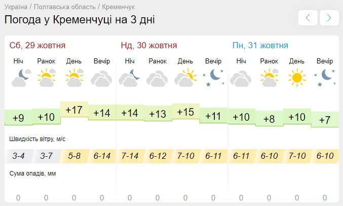 За повідомленням Gismeteo, на вихідних триматиметься здебільшого мінлива хмарність, зате без опадів. У суботу, 29 жовтня, повітря прогріється до теплих +17°С, а у неділю – до +15°С.