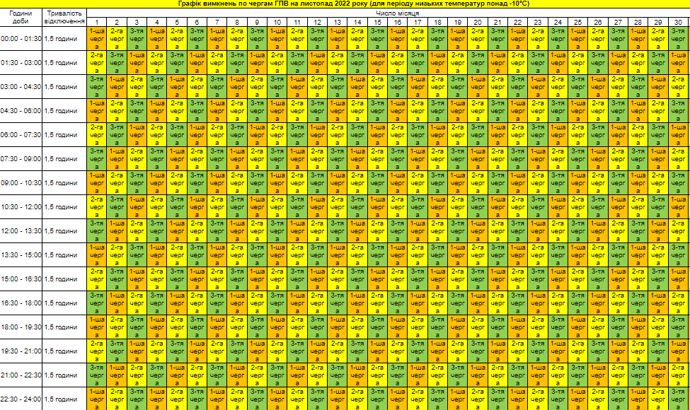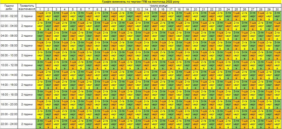 Графік вимкнень на листопад. Тут зазначені день та час вимкнення світла для кожної черги.