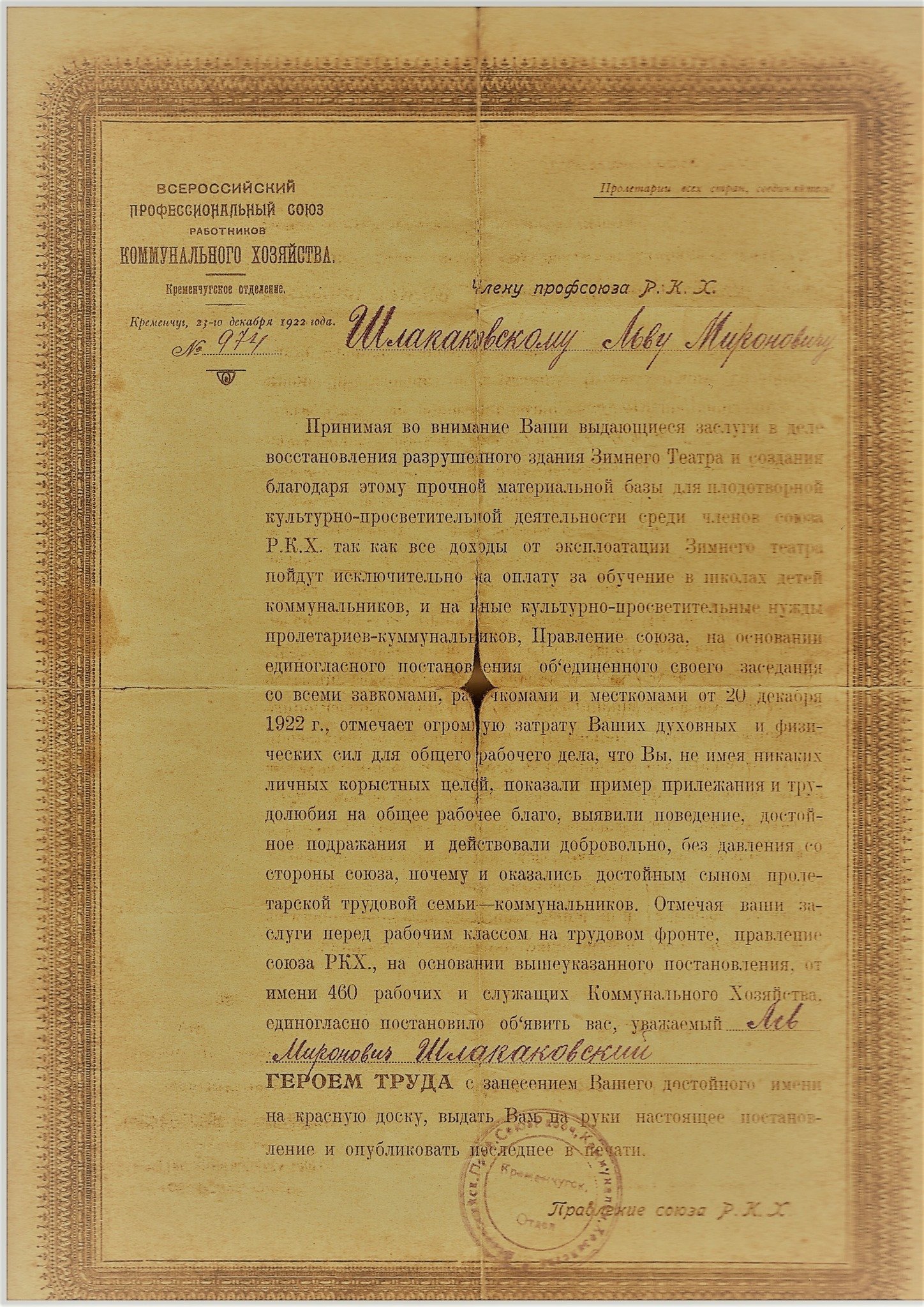 За цю роботу Кременчуцький губернський відділ комунального господарства 23 грудня 1922 р. визнав Шлапаковського Героєм праці з занесенням його імені на Дошку ударників.