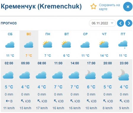 Sinoptik прогнозує, що усі вихідні кременчуцьке небо буде вкрите хмарами, а сонечко не порадує кременчужан. Вночі температура опуститься до +2°С, а вдень сягне максимум +11°С.